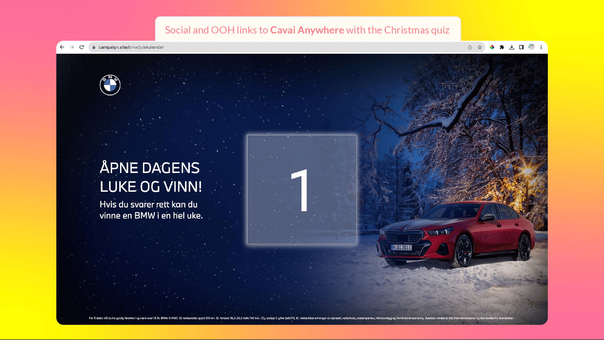 Every day between 1-24 of December, there was a new question related to BMW that people could answer through the interactive Cavai ads. The goal was not only to drive engagement and collect emails but also to evoke a cozy, classic Christmas atmosphere in BMW style. We enhanced the product images with subtle background touches; twinkling stars and a flickering streetlight, drawing attention in a modest way. The concept was framed as a gift to the audience, with the QR code incorporated as a gift tag in the poster design.
